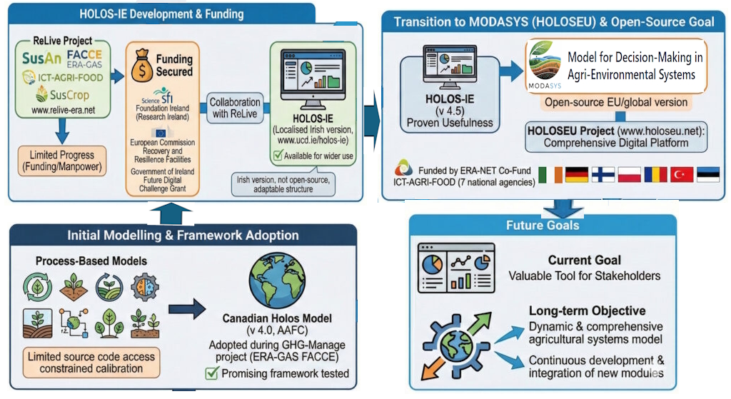 Following the successful testing of the Holos model, we proposed its advancement within the ReLive project, funded by the ERA-NET Cofunds SusAn, FACCE ERA-GAS, ICT-AGRI-FOOD, and SusCrop (www.relive-era.net) led by UCD (Project Manager/Modeller: Dr Ibrahim Khalil, and Coordinator: Prof. Bruce Osborne). However, progress was limited due to constraints in funding and manpower. Shortly thereafter, we secured crucial funding from Science Foundation Ireland (now Research Ireland) via the European Commission Recovery and Resilience Facilities and the Government of Ireland under the Future Digital Challenge Grant led by UCD (Dr. Ibrahim Khalil). This enabled us to collaborate with the ReLive project and focus on developing a localised version for Ireland, resulting in the creation of HOLOS-IE (www.ucd.ie/holos-ie).